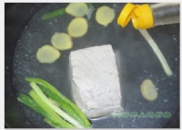 1:锅中放入适量水(能没过肉),放入姜片,葱段和少许料酒,水滚后,将肉放入汤锅中煮熟(约8-10分钟,用筷子能插透肉)。关火后将肉浸泡在原汤中20分钟至温热。