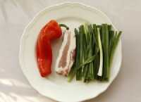 1:五花肉250克、青蒜苗200克、红椒1个、葱段姜片适量。